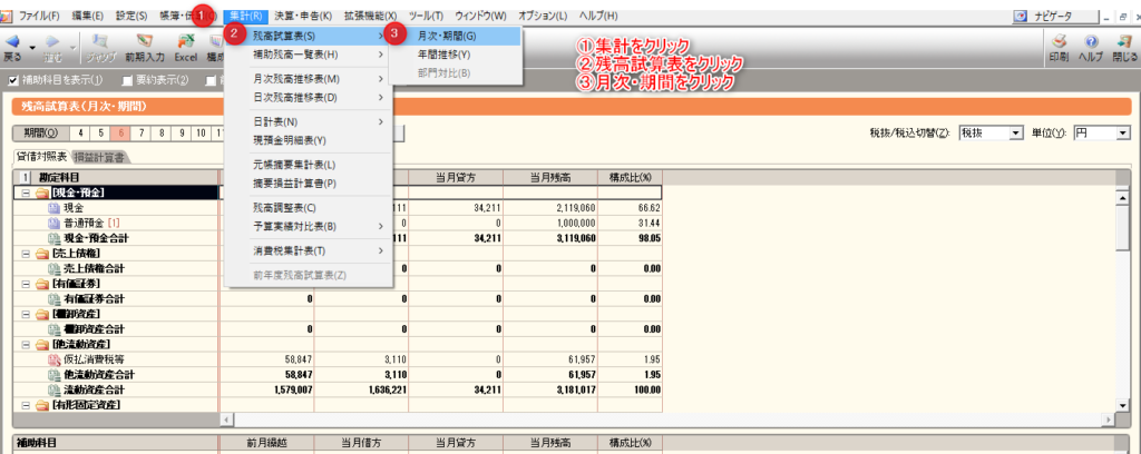 残高試算表が表示されるので出したい試算表の期間をクリック
